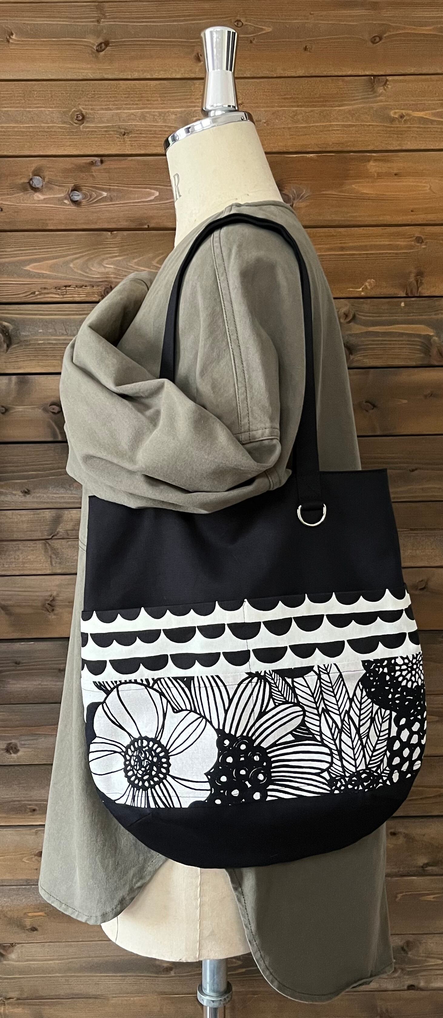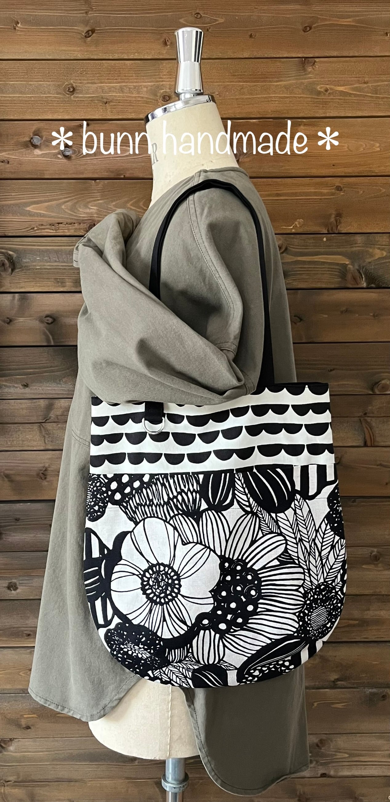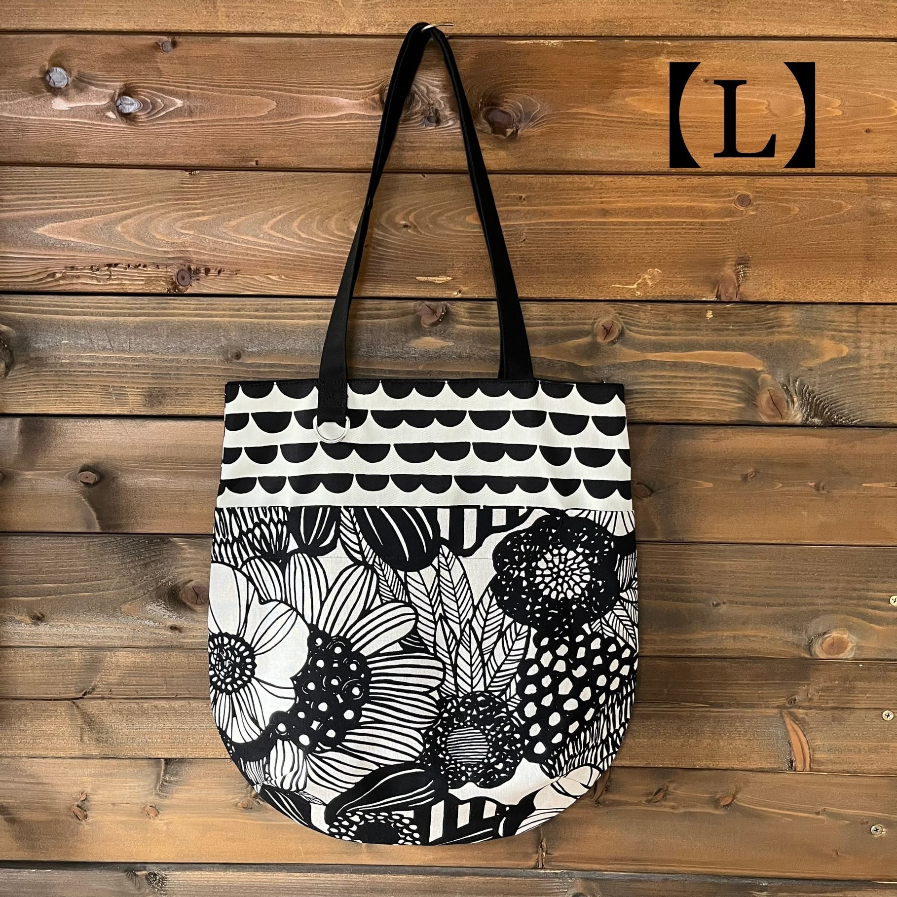 リバーシブル アートフラワー&半円ボーダー 外/内ポケット付きトートバッグ【L】ハンドメイド