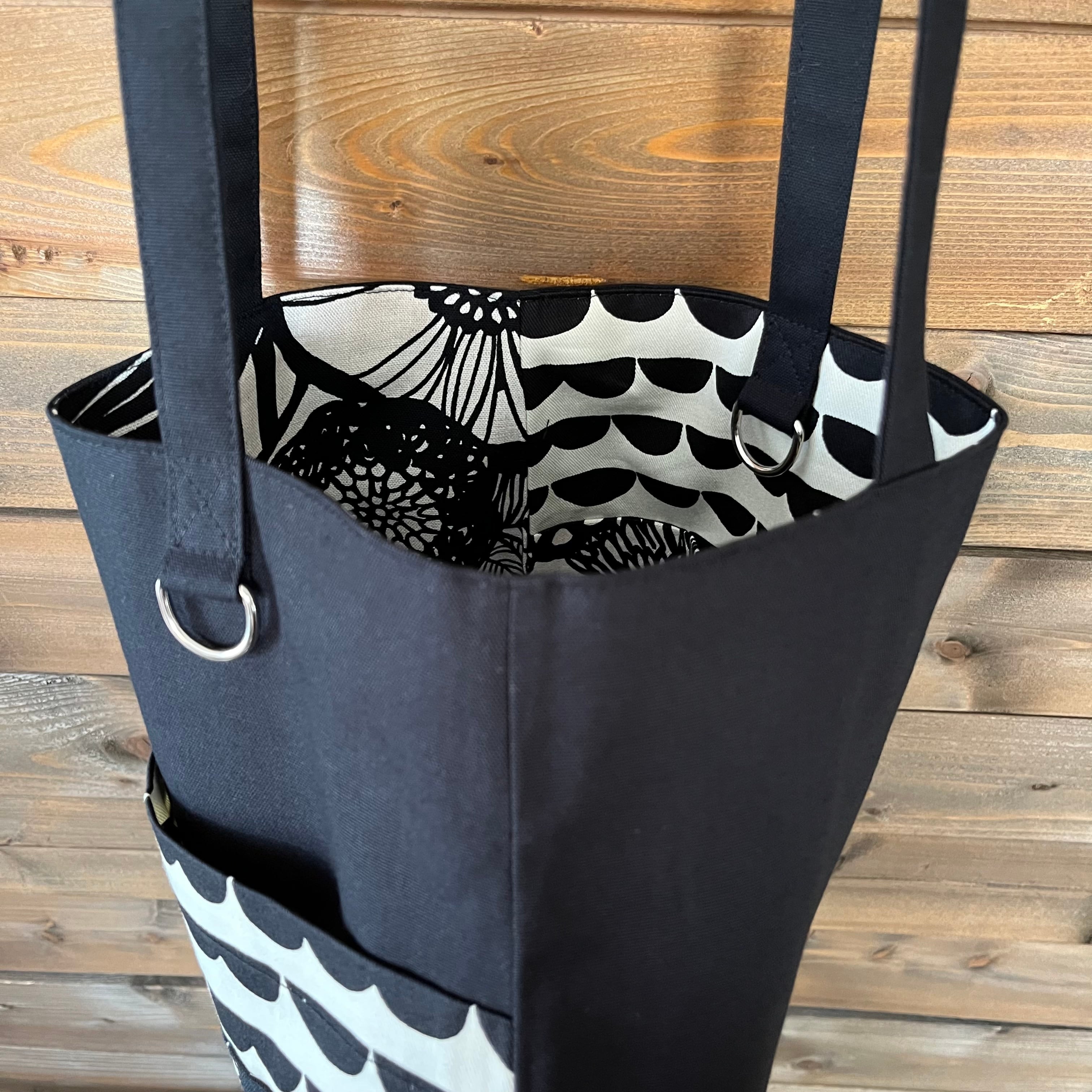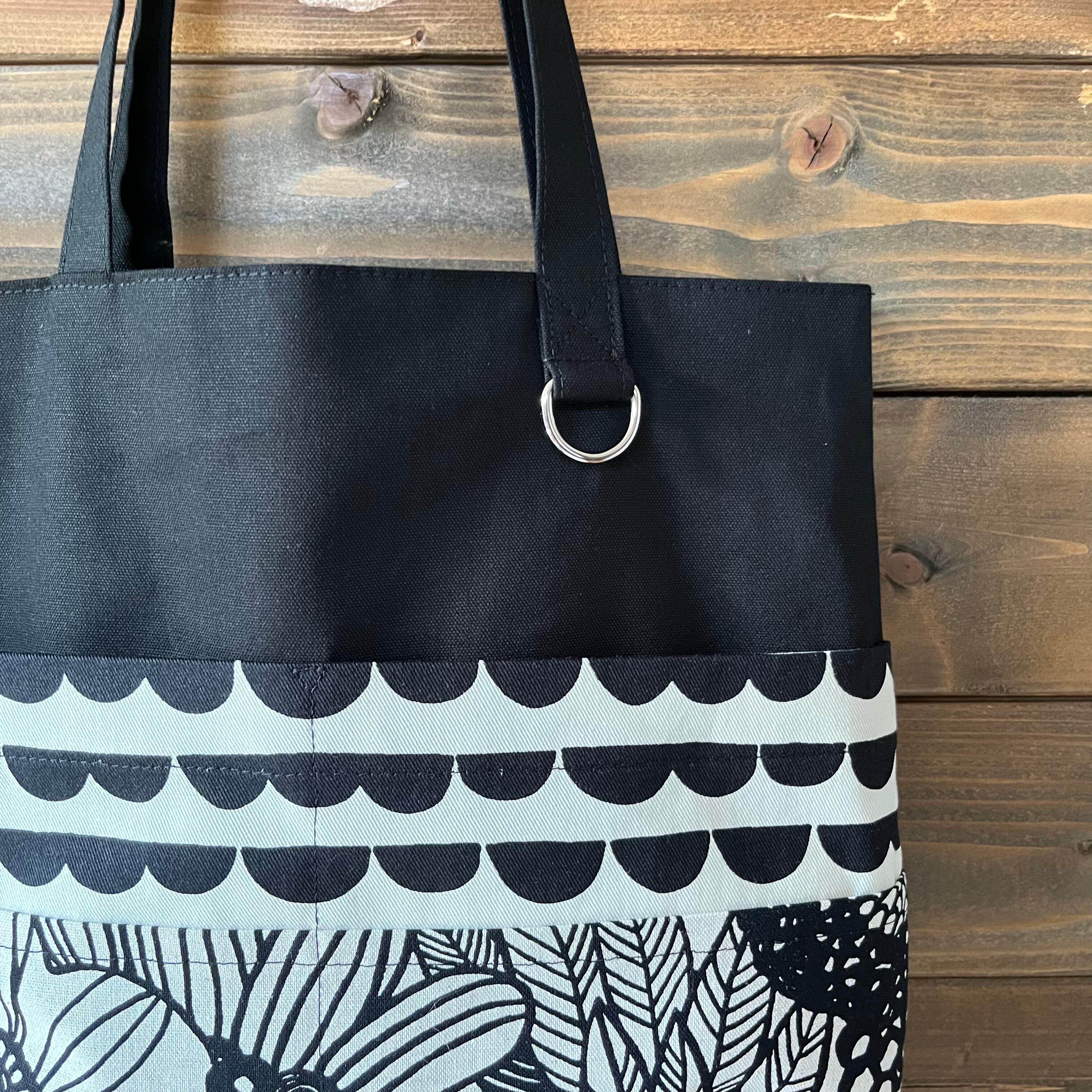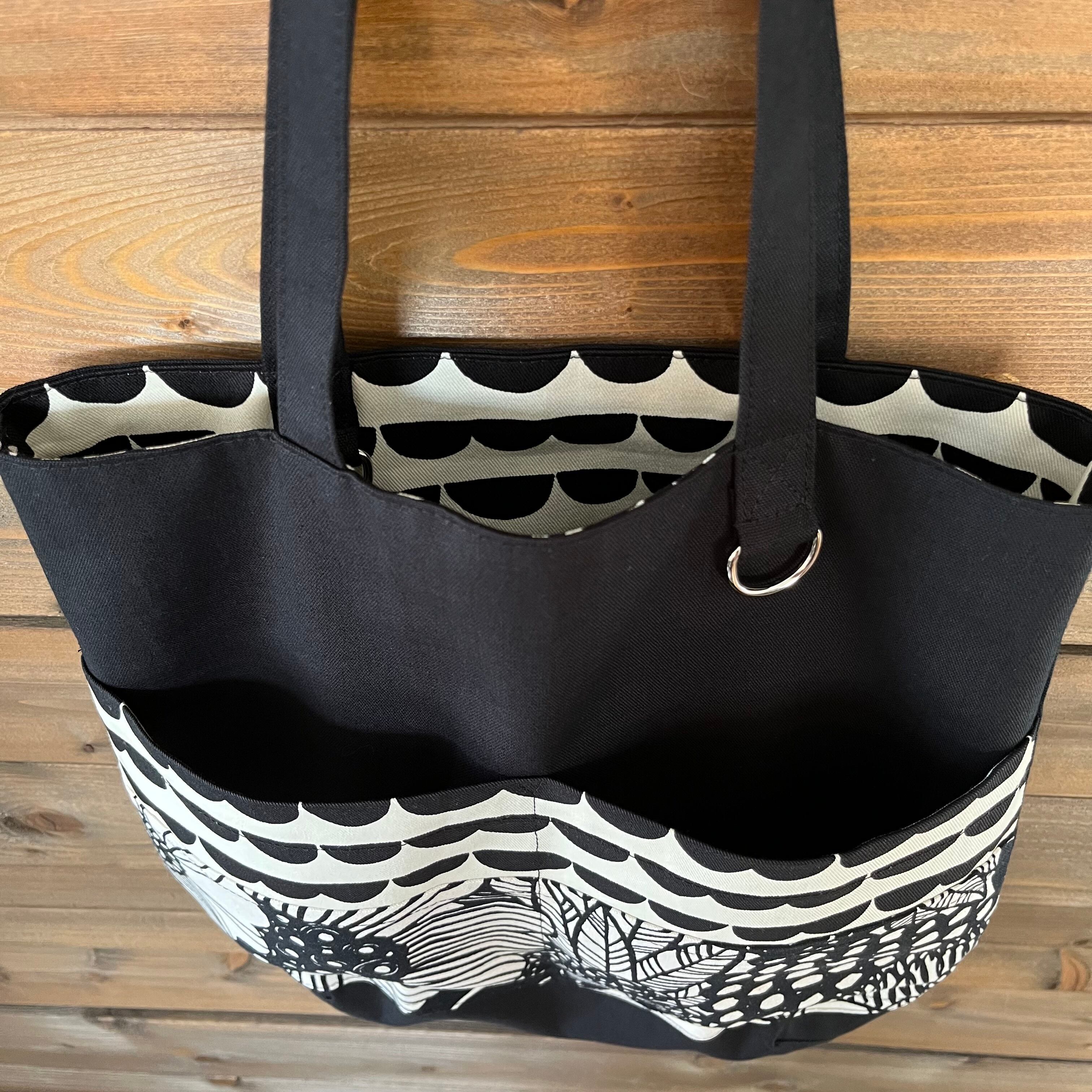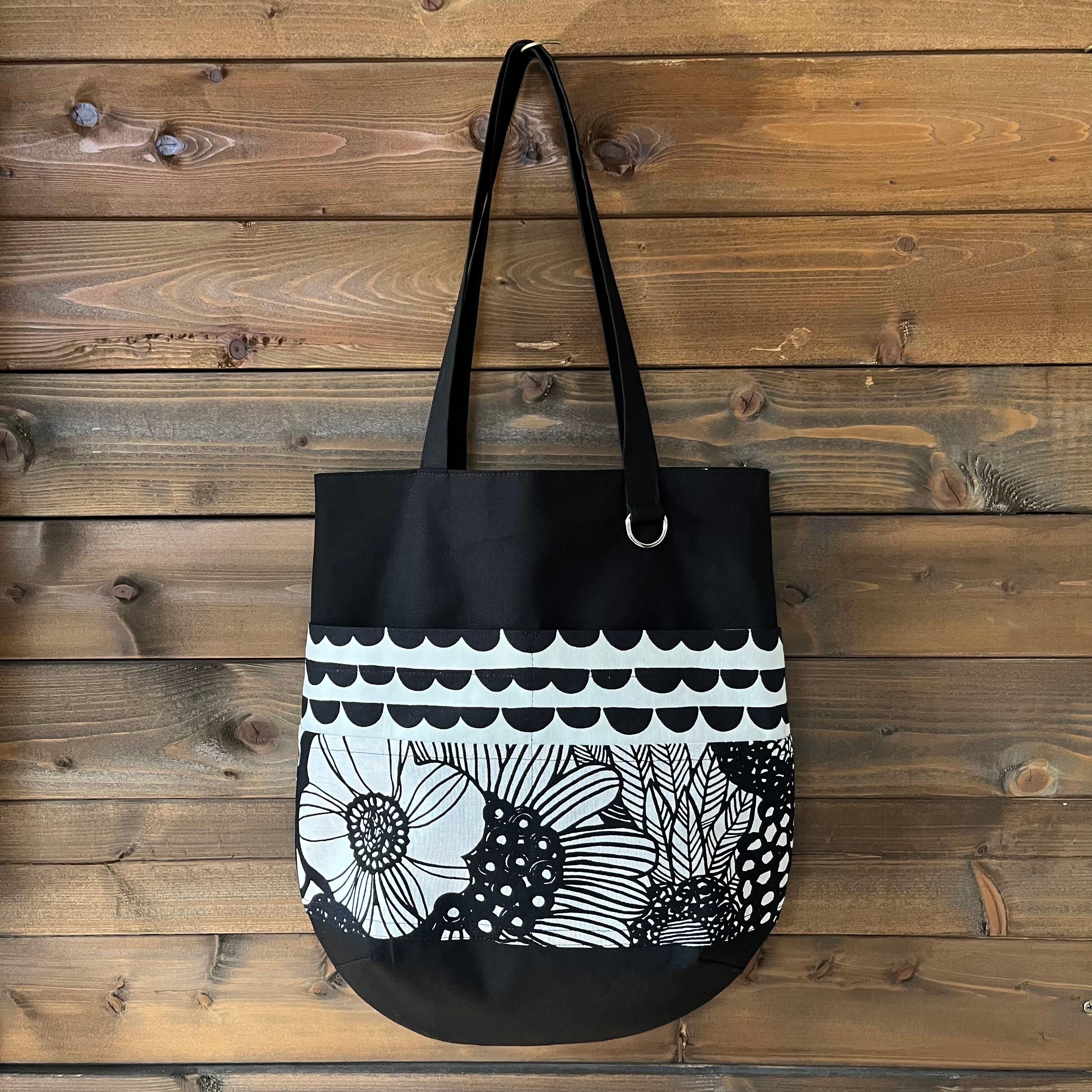 リバーシブル アートフラワー&半円ボーダー 外/内ポケット付きトートバッグ【L】ハンドメイド